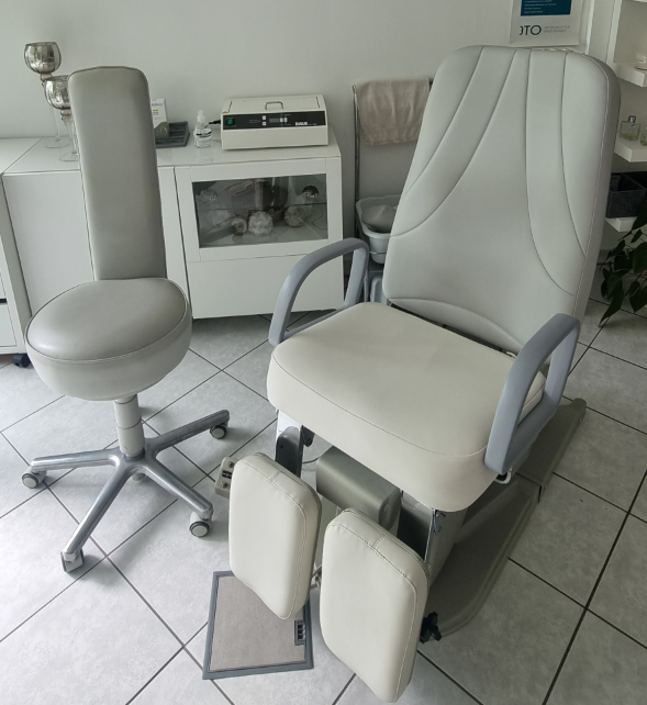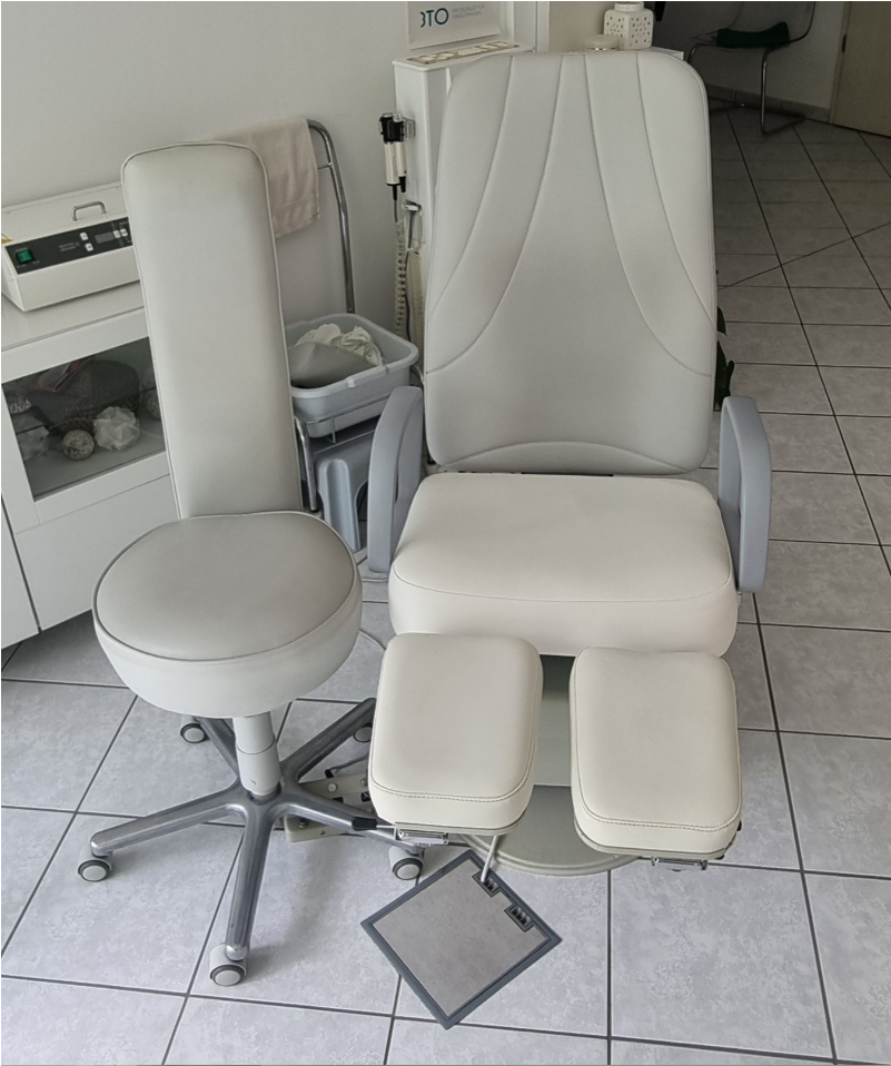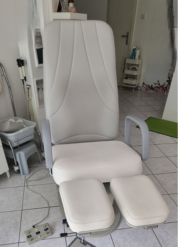 In Höhe und Neigung elektrisch verstellbarer Fußpflegestuhl von der Firma Gerlach inklusiv passenden Arbeitsstuhl. Bein- u. Fußablage manuell verstellbar. Wegen Geschäftsaufgabe für 450€ Festpreis ab dem 27.09. abholbar.